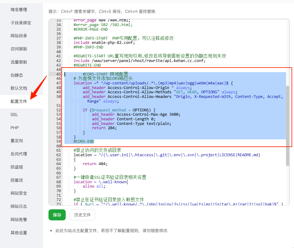 在宝塔面板的现有的nginx配置中添加CORS支持,在 #REWRITE-END